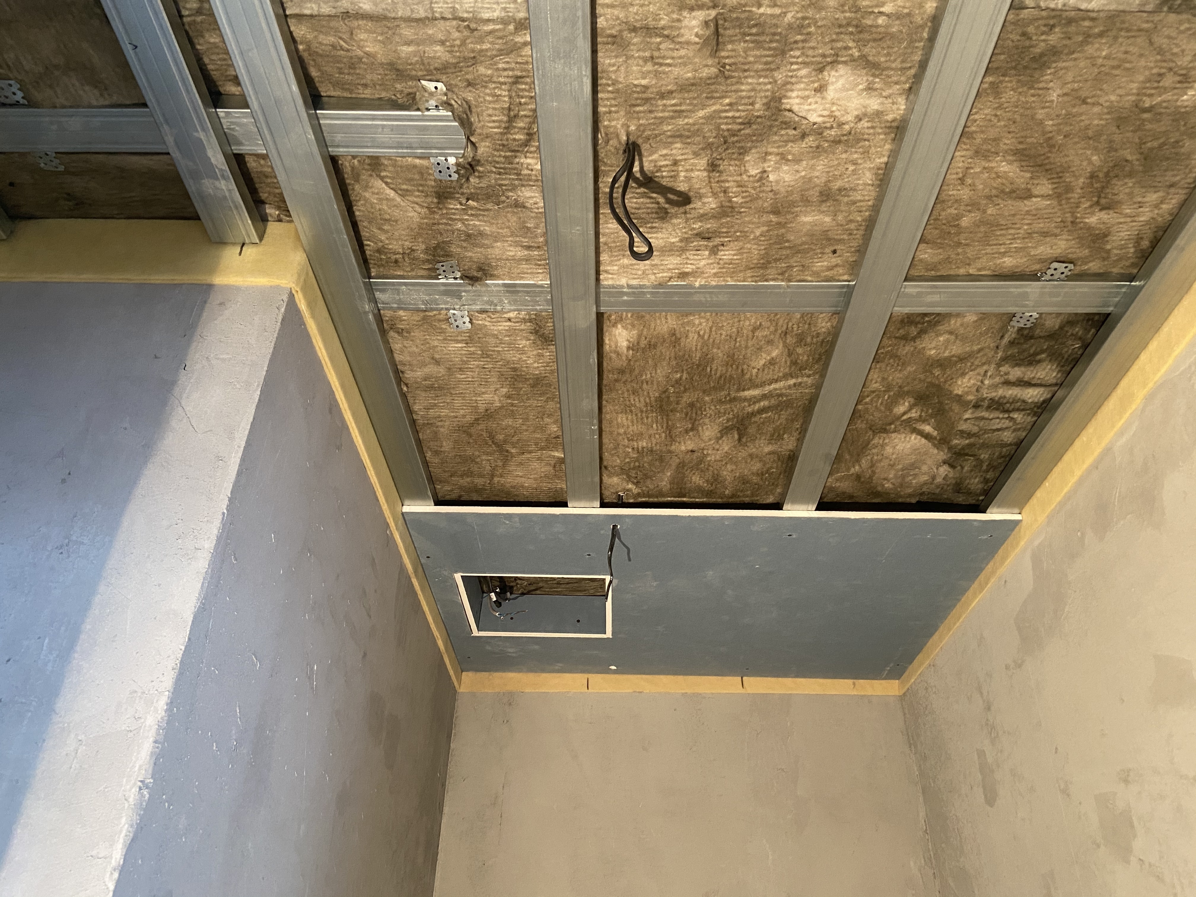 В максимальной комплектации конструкция состоит из металлического двухуровневого каркаса, виброизолирующих подвесов Виброфлекс-Коннект ПП, звукопоглощающей плиты Шуманет-Эко, акустического триплекса Саундлайн-dB и обшивных листов Gyproc AKU-line. Каркас закрепляется к перекрытию с помощью виброизолирующих подвесов Виброфлекс-Коннект ПП.